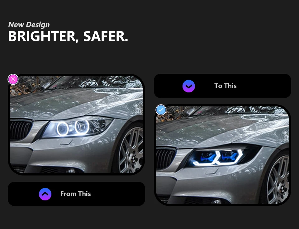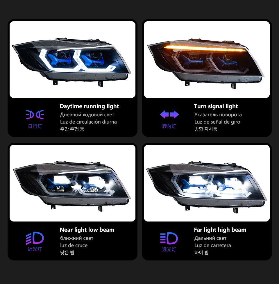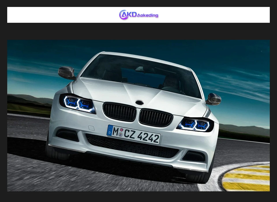Світлодіодні передні фари AKD призначені для BMW 3 серії E90 (2005–2012 років випуску). Вони забезпечують сучасний вигляд, покращену видимість та підвищену безпеку. Фари оснащені яскравими денними ходовими вогнями (DRL), проекційними лінзами та адаптивним підсвічуванням, що забезпечує оптимальне освітлення дороги в різних умовах.